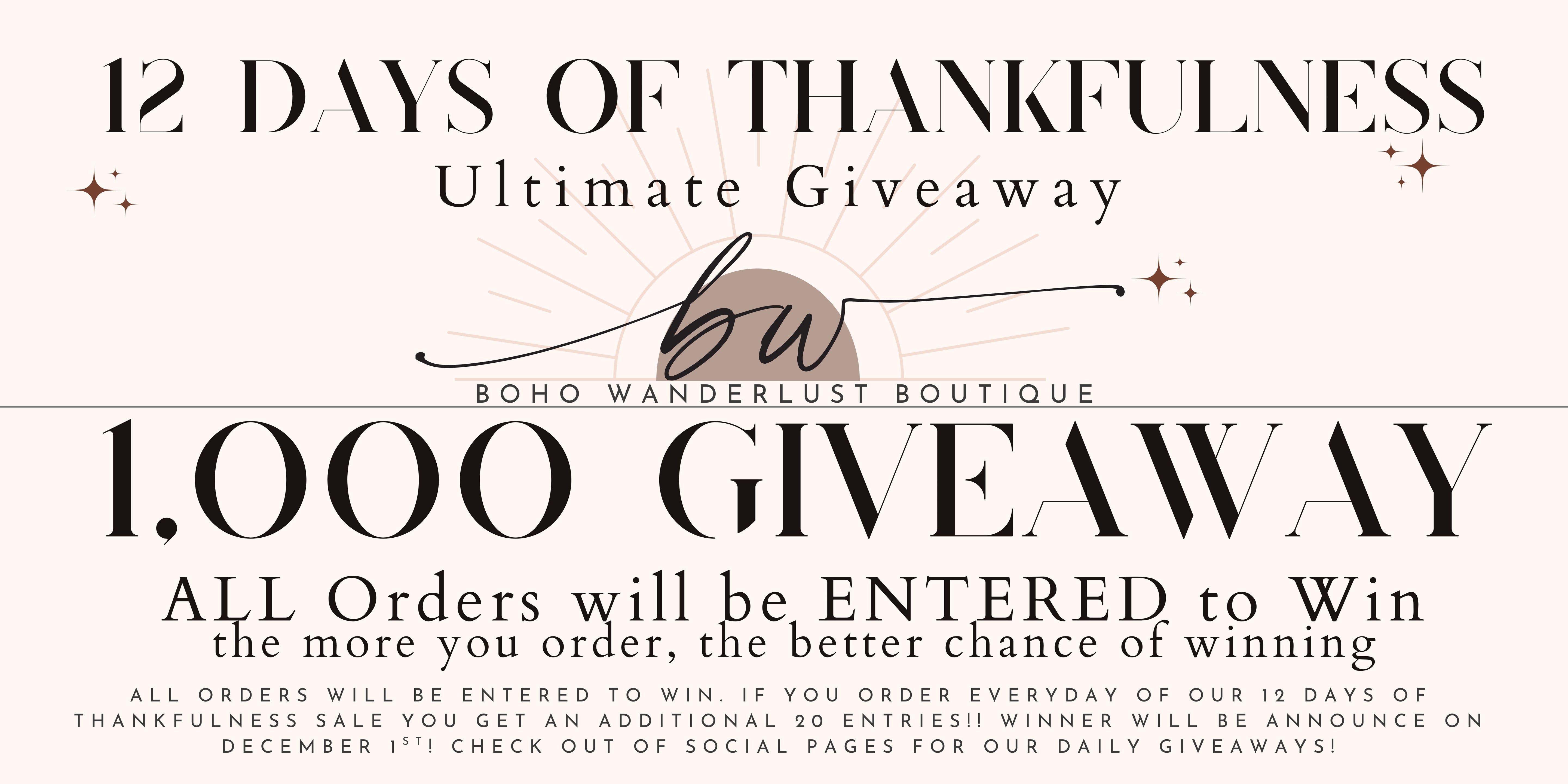 All Orders will be entered to win. If you order everyday of our 12 Days of Thankfulness Sale you get an additional 20 Entries!! The Winner will be announce on December 1st! Check out of Social Pages for our Daily giveaways! $1000 will be in the form of store credit