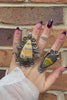 This stunning handcrafted ring features a striking teardrop-shaped banded stone showcasing rich layers of golden yellow, gray, and smoky tones. The stone is beautifully polished to a glossy finish and set in an ornate sterling silver bezel with delicate beaded detailing around the edge. Floral accents at the top add a touch of vintage charm and artistry. Bold yet elegant, this piece captures the earthy beauty of natural stone and the timeless craftsmanship of artisan jewelry—perfect for collectors or anyone who loves unique statement pieces.