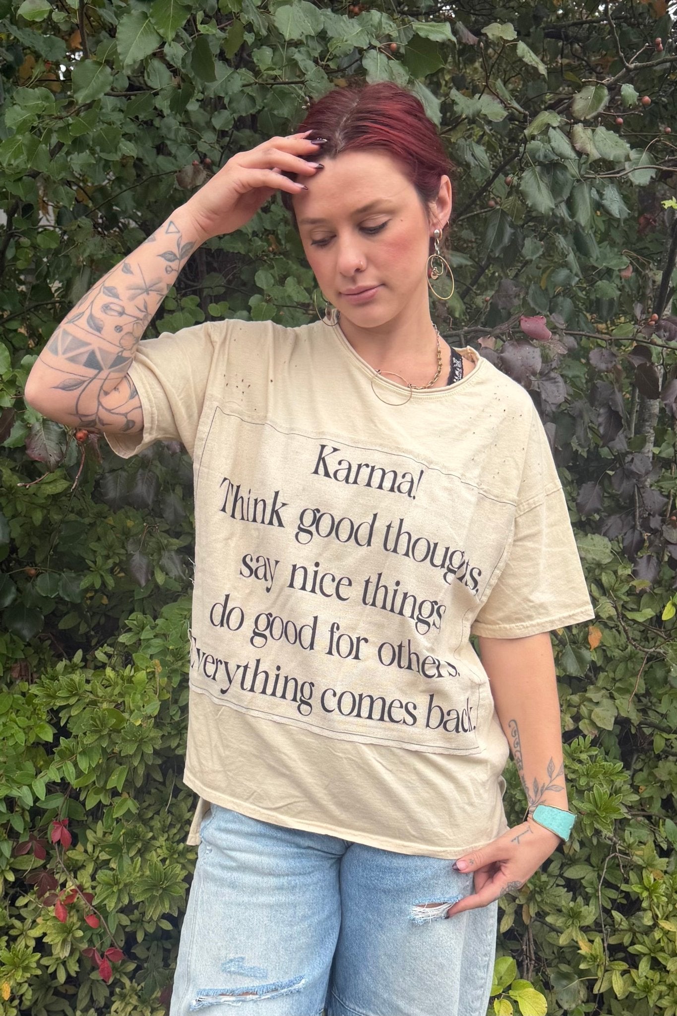 This Karma tee in 100% cotton jersey oversized t-shirt is proudly made in the USA. This ultra-comfortable, soft-touch tee features a patchwork print that reads, “Karma! Think good thoughts, say nice things, do good for others. Everything comes back.” Available in sizes Small, Medium, Large, and X-Large, its relaxed, roomy fit is perfect for wearing loose for a laid-back look or knotted for a trendy, cinched style. Crafted with quality and versatility in mind, this tee is your go-to for everyday cool.100% Cotton Jersey Patchwork Print of popular Karma saying Oversized Made in the USA Wear loose or knotted