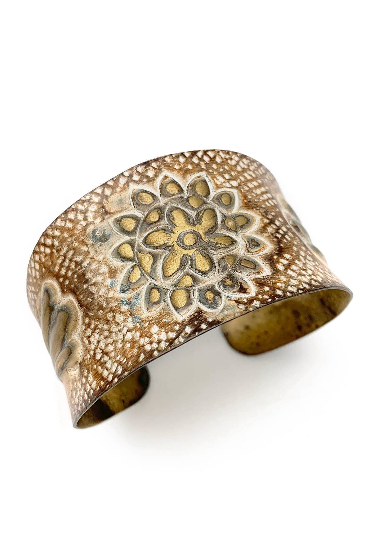 Brass Patina Bracelet - Warm Brown and White Sunflower